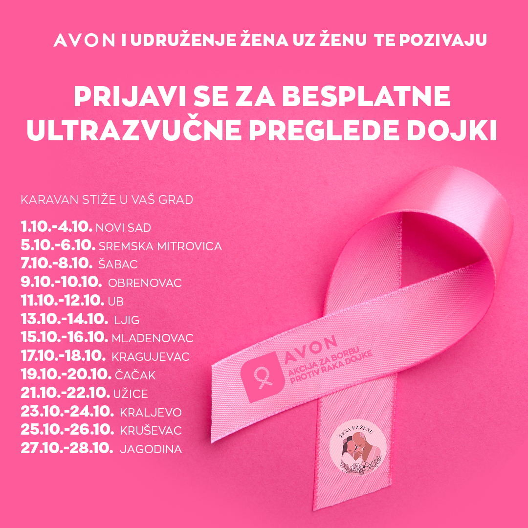 Tokom oktobra, međunarodnog meseca borbe protiv raka dojke, kompanija Avon je u okviru Akcije za borbu protiv raka dojke, koja se sprovodi od 2004. godine, uručila donaciju udruženju „Žena uz ženu“ i na taj način pomogla da se pokrene akcija „Budi hrabra – pregledaj se“. Pokretna ordinacija sa ultrazvučnim aparatom i pratećom opremom tokom oktobra biće dostupna u gradovima širom Srbije svim ženama do 45. godine koje žele da obave preventivne preglede dojki i da informišu o značaju prevencije i ranog otkrivanja i lečenja raka dojke.