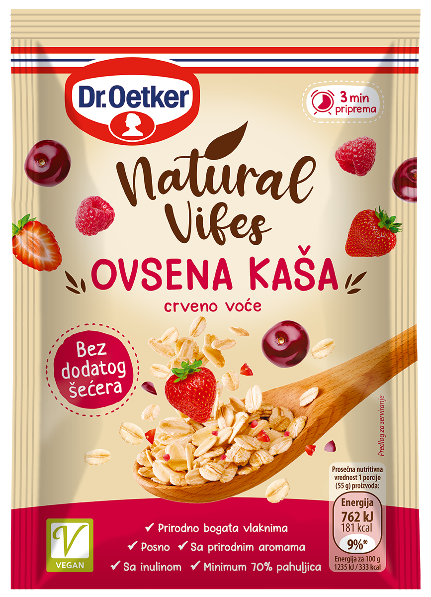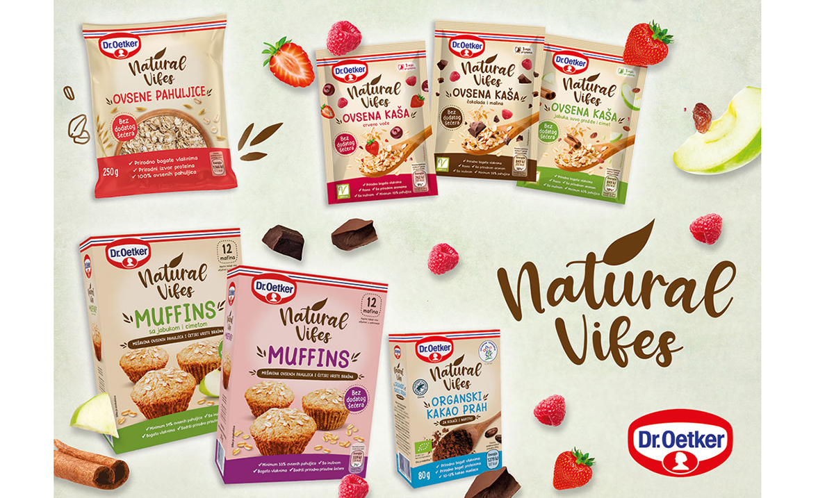 Natural Vibes je nova Dr. Oetker linija proizvoda bez dodatog šećera, koja donosi vedrinu tokom celog dana uz jednostavno kontrolisanje unosa kalorija. Ovu prirodniju liniju čine mafini, organski kakao prah, ovsene pahuljice i ovsene kaše u tri omiljena ukusa.