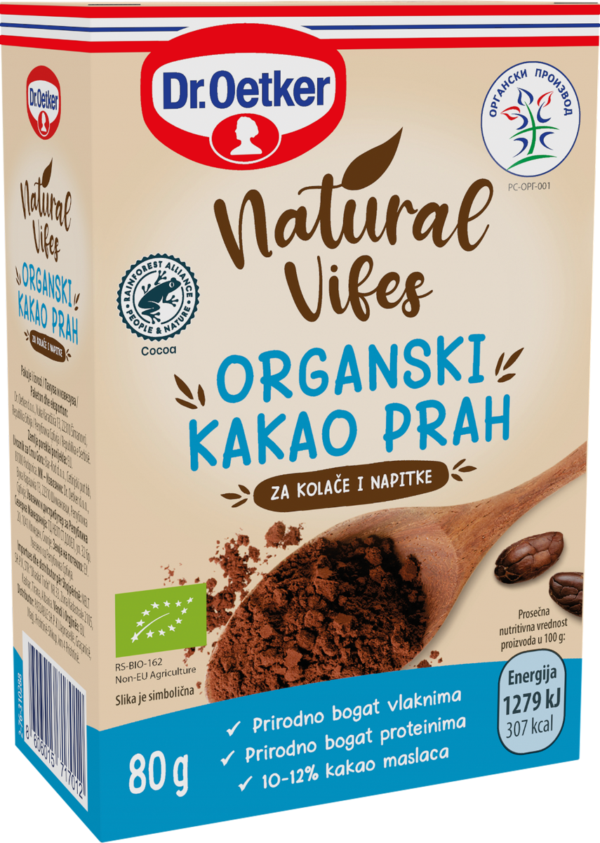 Ljubitelje čokoladnih draži obradovaće Natural Vibes organski kakao prah sa redukovanim sadržajem kakao maslaca. U njemu se uživa kao u ukusnom napitku, a ujedno ga možete upotrebljavati i za pripremu deserata. Natural Vibes organski kakao prah je prirodno bogat vlaknima i proteinima, i ozvaničen je međunarodnim sertifikatom „Rainforest alliance“ kao proizvod nastao kroz napor za očuvanjem životne sredine i prava ljudi.