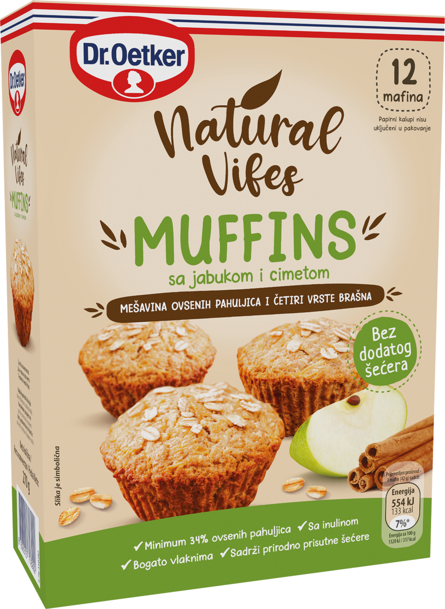 U Natural Vibes mafinima i Natural Vibes mafinima sa jabukom i cimetom, možete da uživate, bilo u vidu praktične užine ili posluženja u raznim prilikama. Oduševljavaju ukusom, ali i činjenicom da su bez dodatog šećera. Sadrže inulin, minimum 33% pahuljica od celog zrna ovsa i četiri vrste brašna – pirinčano, pšenično, ječmeno i integralno raženo. Priprema je brza i laka.