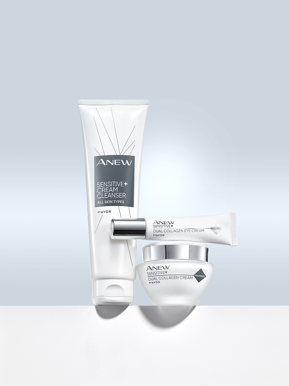Anew Sensitive+ kolekciju koja pruža tri koraka nege čine Anew Sensitive+ kremasto sredstvo za čišćenje lica koje uklanja nečistoće, masnoću i šminku sa kože, Anew Sensitive+ Dual Collagen krema za predeo oko očiju koja umanjuje osećaj suvoće i crvenila, i obogaćena je ekskluzivnim ProtinolomTM kao i Anew Sensitive+ Dual Collagen krema za lice koja se bori protiv znakova starenja i vraća osećaj zategnutosti i elastičnosti.