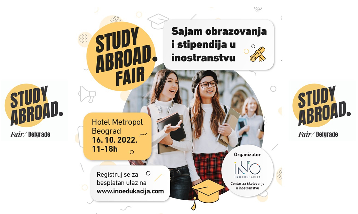 Study Abroad. Fair 2022 namenjen je srednjoškolcima, studentima i roditeljima i na njemu će se, kroz svoje štandove u velikoj sali hotela Metropol, predstaviti srednje škole iz inostranstva, srednjoškolske razmene u Americi, škole jezika i fakulteti iz inostranstva. Na štandovima će biti predstavnici različitih obrazovnih institucija iz inostranstva i svi prisutni moći će da pitaju sve što ih zanima, da saznaju koje programe i stipendije nude, kao i koji tip programa je idealan za vas.