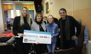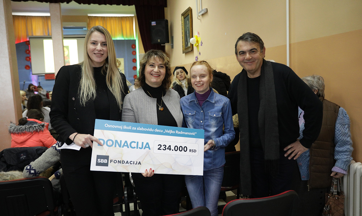 Emili Fink predstavnica SBB fondacije, direktorka škole Jelena Vukić, učenica Daria i Miroslav Radaković