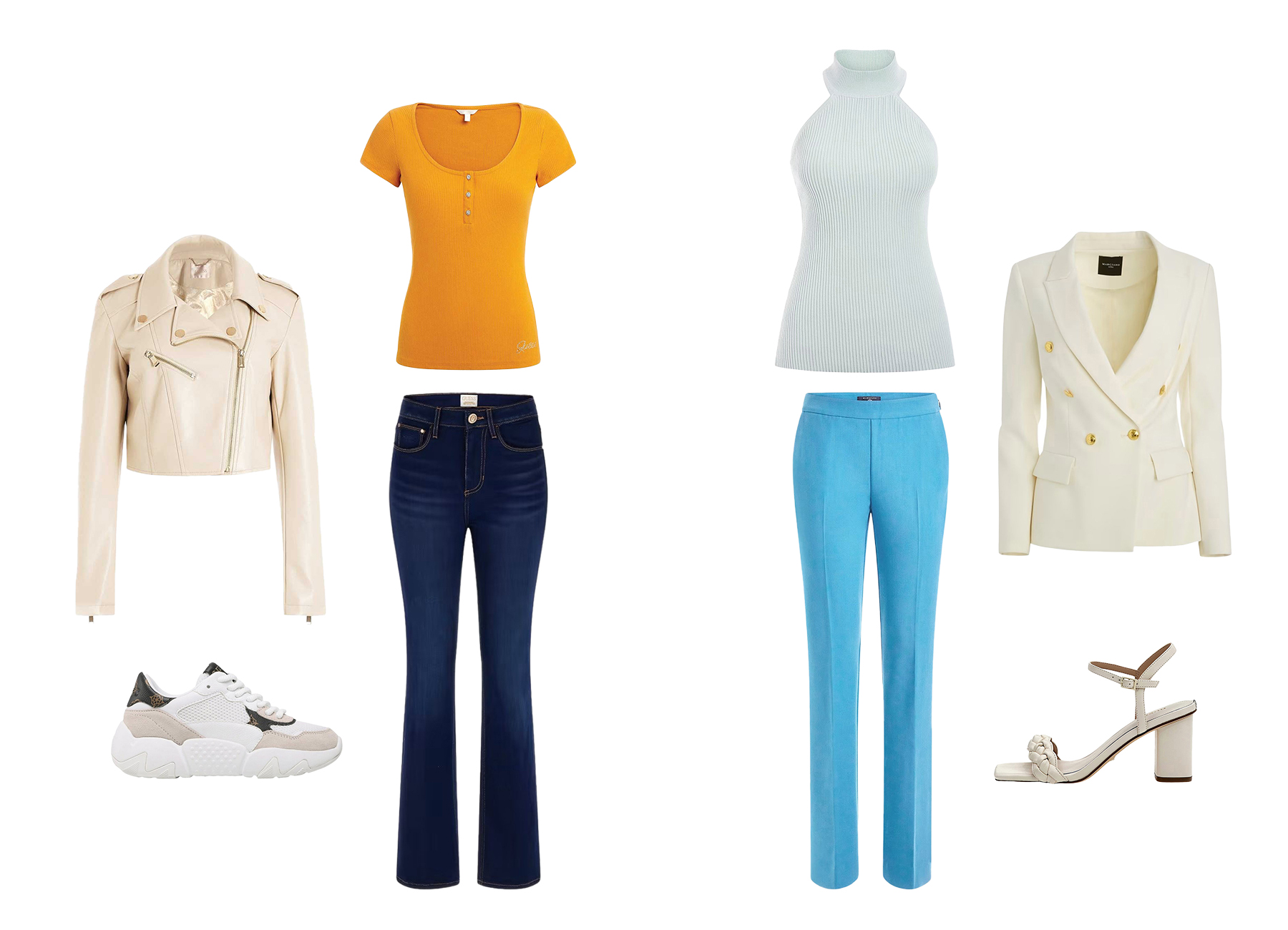 bež jakna patike narandžasta majica tamnoplave farmerke Marciano beli sako elegantne pantalone rebrasti top bele sandale