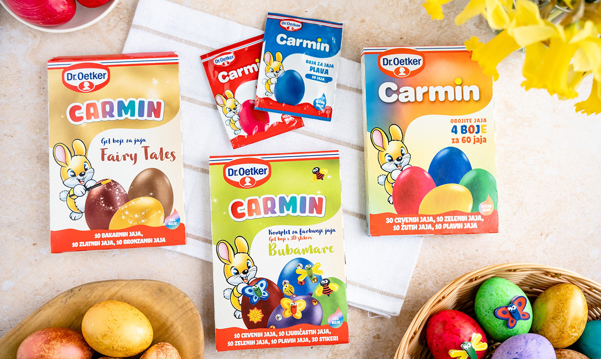 Takođe novitet je i Carmin gel boja sa 3D stikerima za farbanje jaja u četiri boje: crvenu, ljubičastu, zelenu i plavu, dovoljna za farbanje 40 jaja, sa motivima ljupkih bubamarica za dodatno ukrašavanje, uz par rukavica.