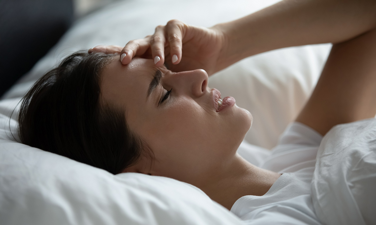 Headache attack. Sad frustrated millennial female spending time in bed lying in pillows touching forehead suffering from migraine fever insomnia feeling ill sick unhealthy waking up after bad dream