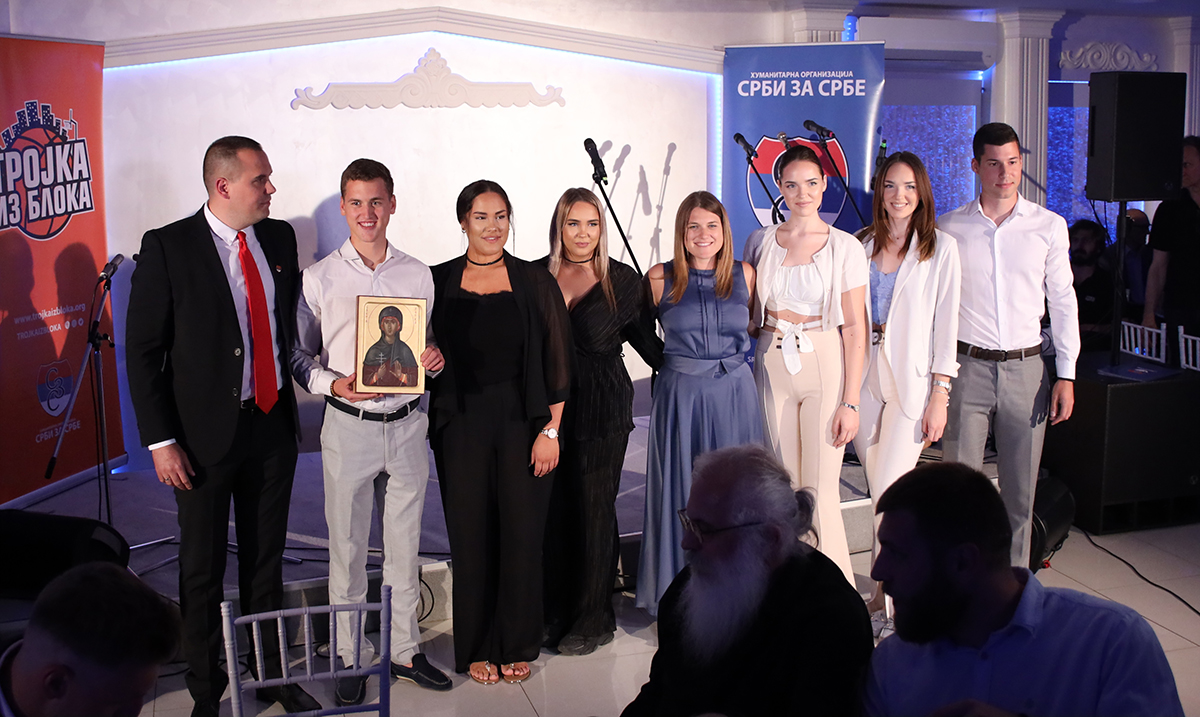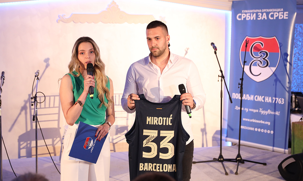 Na humanitarnoj aukciji licitiran je dres proslavljenog košarkaša Nikole Mirotića, velikog prijatelja Humanitarne organizacije Srbi za Srbe koji niže uspehe u Barseloni, košarkaške lopte KK Crvena Zvezda i KK Partizan, sa potpisima svih igrača i prepis stranice Miroslavljevog jevanđelja koja je dar našeg najboljeg kaligrafa Dušana Mišića.