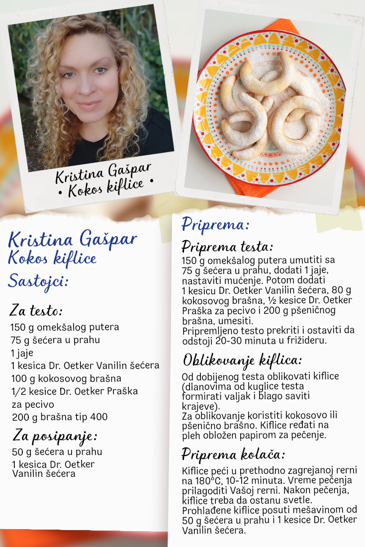 Da je kvalitet najbolji recept, potvrdile su i Kristina Gašpar i Marina Stanojević, dve strastvene ljubiteljke kulinarskih čarolija, koje su pobedile na konkursu „Dr. Oetker sa tvojim potpisom“. Njihovi posebni recepti za Kokos kiflice i Rešetkasti kolač sa višnjama će krasiti pakovanja Dr. Oetker Vanilin šećera i Praška za pecivo, i takva serija proizvoda će biti dostupna potrošačima tokom narednih godinu dana.