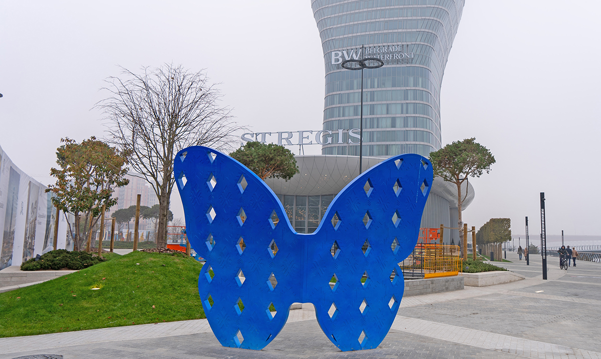 Osim „izniklog“ cveta, u Beograd na vodi je nedavno „sleteo“ i veliki plavi leptir raširenih krila, koji se nastanio na platou ispred Kule Beograd, najviše zgrade u Srbiji i regionu i budućeg centra kulturno-umetničkih dešavanja u gradu.