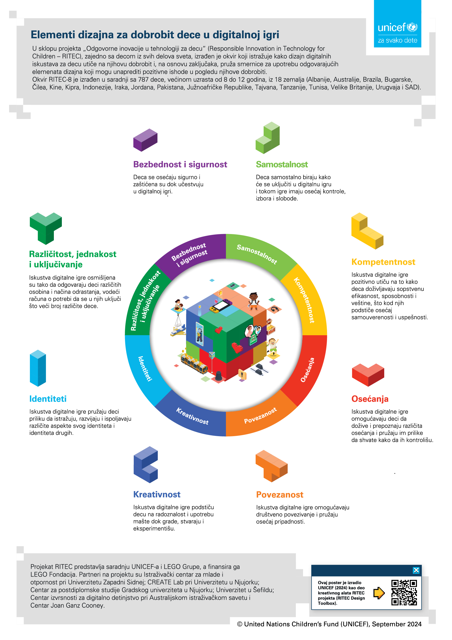 Prepoznajući potencijal tehnologije da pozitivno utiče na razvoj i dobrobit dece, ali i rizike koje nosi, UNICEF je, u saradnji sa LEGO Fondacijom, razvio RITEC Design Toolbox — besplatan i sveobuhvatan skup resursa sa praktičnim savetima za gejming industriju. Ovaj alat pruža smernice za kreiranje digitalnih igara koje promovišu dobrobit dece. Baziran na nedavnom UNICEF-ovom istraživanju koje pokazuje da dobro osmišljene video igre mogu značajno doprineti razvoju dece, RITEC Design Toolbox namenjen je dizajnerima i profesionalcima koji oblikuju digitalne igre, nudeći konkretne korake za odgovoran dizajn.