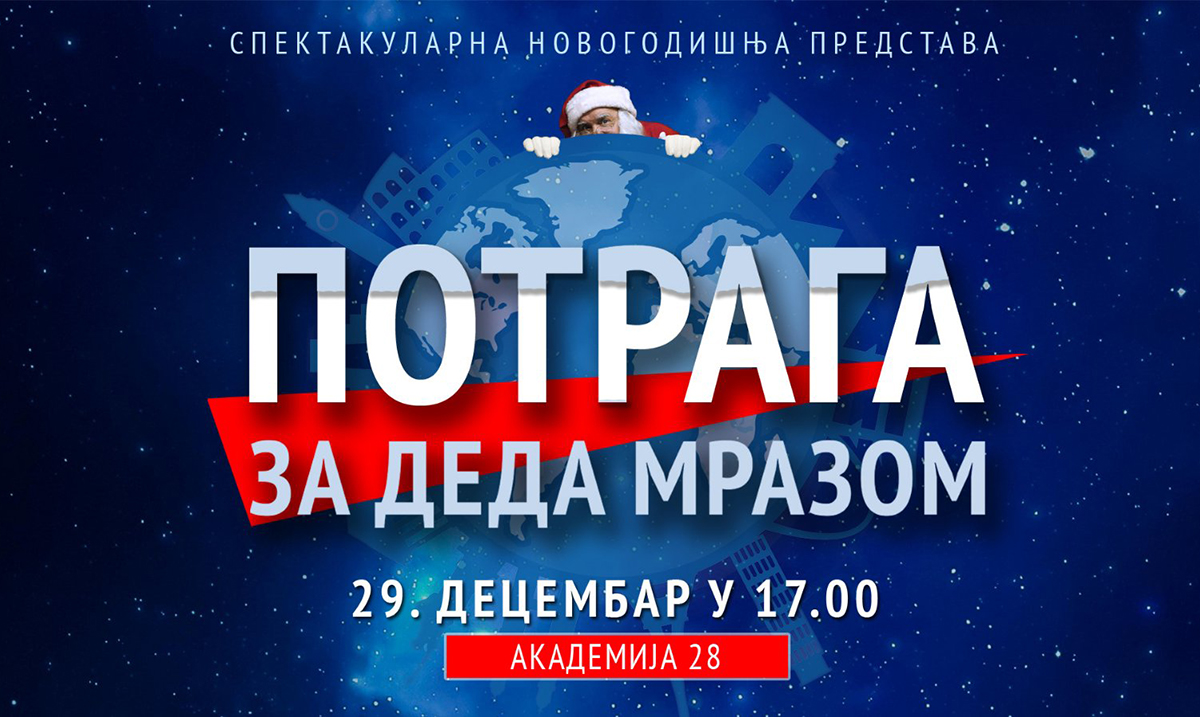 U duhovitoj i uzbudljivoj novogodišnjoj predstavi, „Potraga za Deda Mrazom“, koja će biti izvedena 29. decembra u 17 sati u Akademiji 28, mališani će imati priliku da zajedno sa Baba Mrazicom i Jelkicom Jelom obiđu daleke i egzotične zemlje, upoznaju nove ljude i kulture, i dožive neočekivane avanture – možda čak i ljubav! Narednog dana, 30. decembra, predstava će biti izvedena u Domu Vojske, u Nišu od 18 sati.