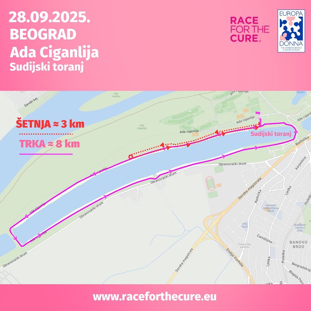 Evropa Dona Srbija, srpski forum protiv raka dojke sa ponosom najavljuje novo izdanje najveće evropske manifestacije posvećene prevenciji i podršci ženama obolelim od raka dojke Race for the Cure, koja će se održati u nedelju, 28. septembra 2025. godine na dobro poznatoj lokaciji, Adi Ciganliji u Beogradu. Svečano otvaranje događaja predviđeno je u 9:30, početak trke u 10h, a šetnje u 11h. Svečano zatvaranje manifestacije je u 12h.
