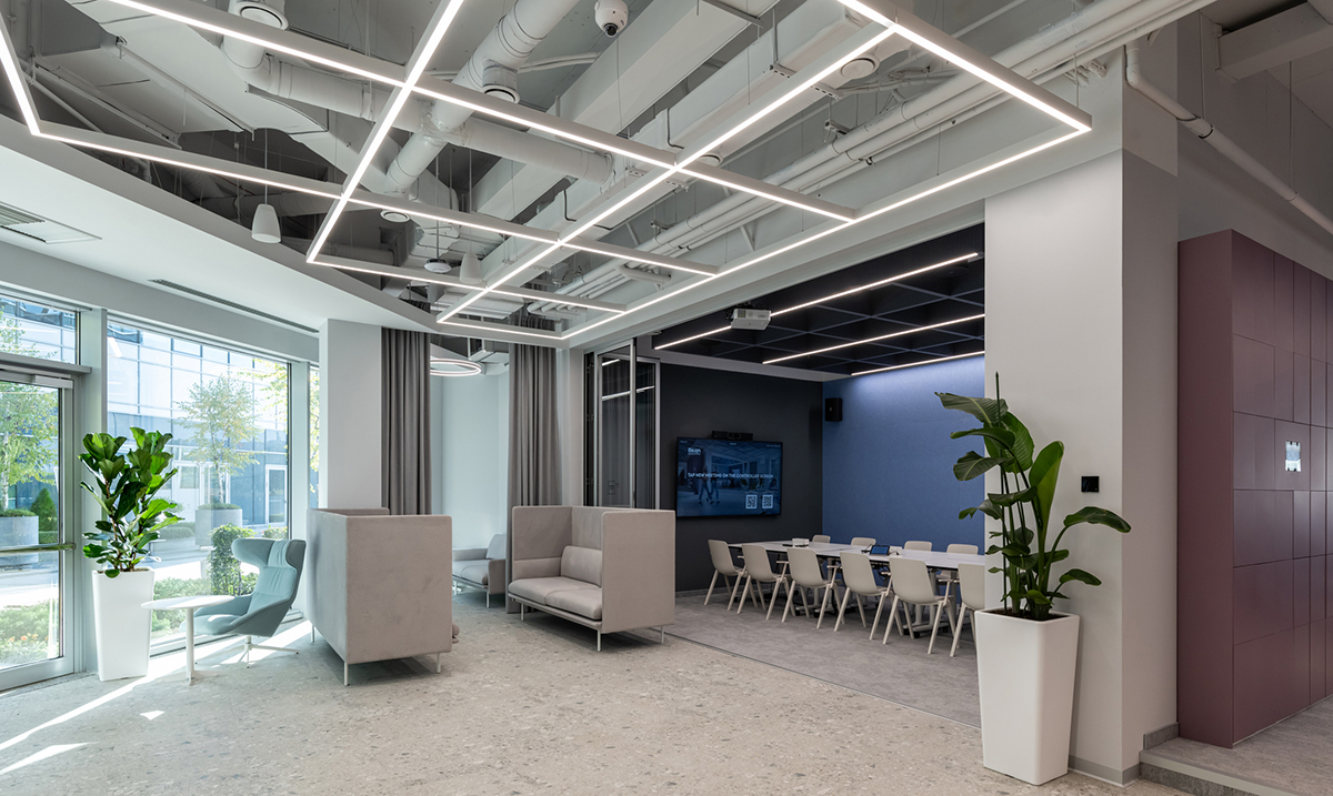 Prostor je pažljivo osmišljen da odgovori na različite potrebe zaposlenih: tihe zone za bolji fokus, fleksibilne prostore za timski rad sa više od 20 tipologija sedenja što je pogodno i za hibridni i svakodnevni rad, konferencijske sale i deo za održavanje događaja.
