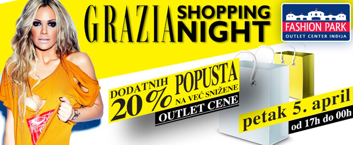 U Fashion Park Outlet Centru Inđija, u petak 5. aprila održaće se Grazia Shopping Night. Prva ovogodišnja Noć kupovine počeće u 17 sati i trajaće do ponoći, a kupce očekuje fantastičan šoping uz dodatni popust od 20 odsto na već snižene outlet cene poznatih brendova, kao i raznovrstan zabavni program.