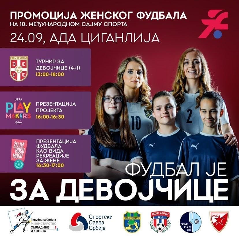 Fudbalski savez Srbije, tradicionalno učestvuje na Sajmu sporta, a ove godine u okviru kampanje ”Fudbal je za devojčice” FSS promoviše ženski fudbal kroz turnir formata 4+1, koji se održava u petak, 24. septembra sa početkom u 13 časova. Učešće u turniru su uzele razvojne selekcije ženskih fudbalskih klubova Crvene zvezde, Zemuna, Heroja i Rada.