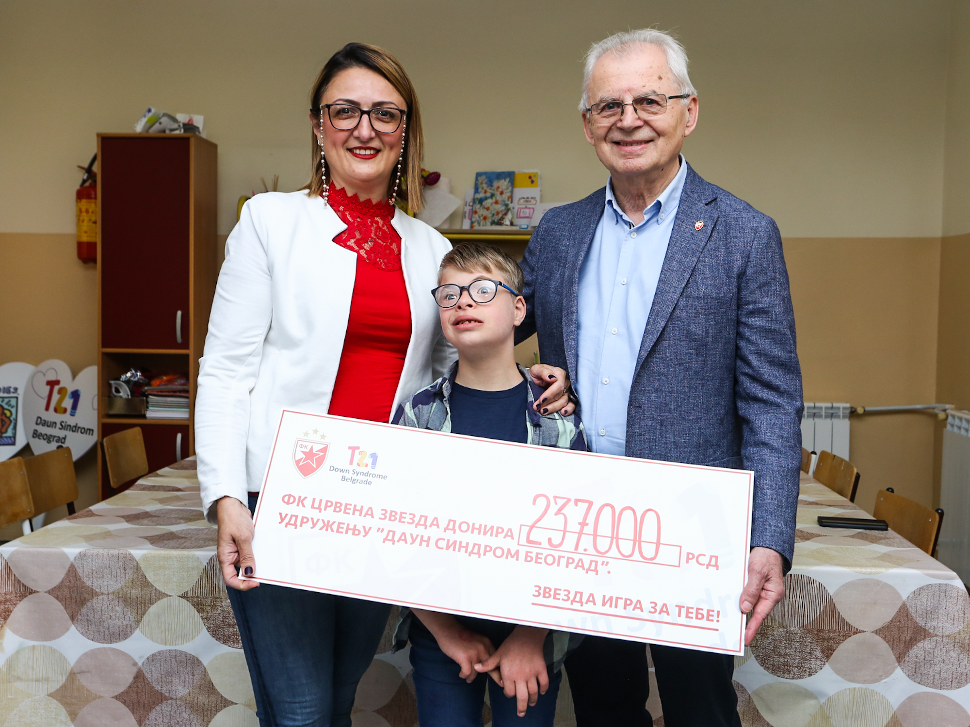 Naš klub nastavlja sa humanitarnim radom, a prve dve posete Zvezdine delegacije su bile Savezu udruženja Srbije za pomoć osobama sa autizmom (214 hiljada dinara) i Udruženju gluvih Beograda (596 hiljada i 900 dinara), posle utakmica sa TSC-om i kragujevačkim Radničkim. Veći deo prihoda od ulaznica sa 167. večitog derbija (873 hiljade) pripao je Savezu slepih Srbije, dok je ostatak novca bio usmeren ka ostalim udruženjima. Ovoga puta smo bili u poseti Udruženju za pomoć osobama sa Daunovim sindromom, a tom prilikom je uručena novčana pomoć u iznosu od 237 hiljada dinara, koju su navijači prikupili kupovinom ulaznica za meč protiv Čukaričkog.