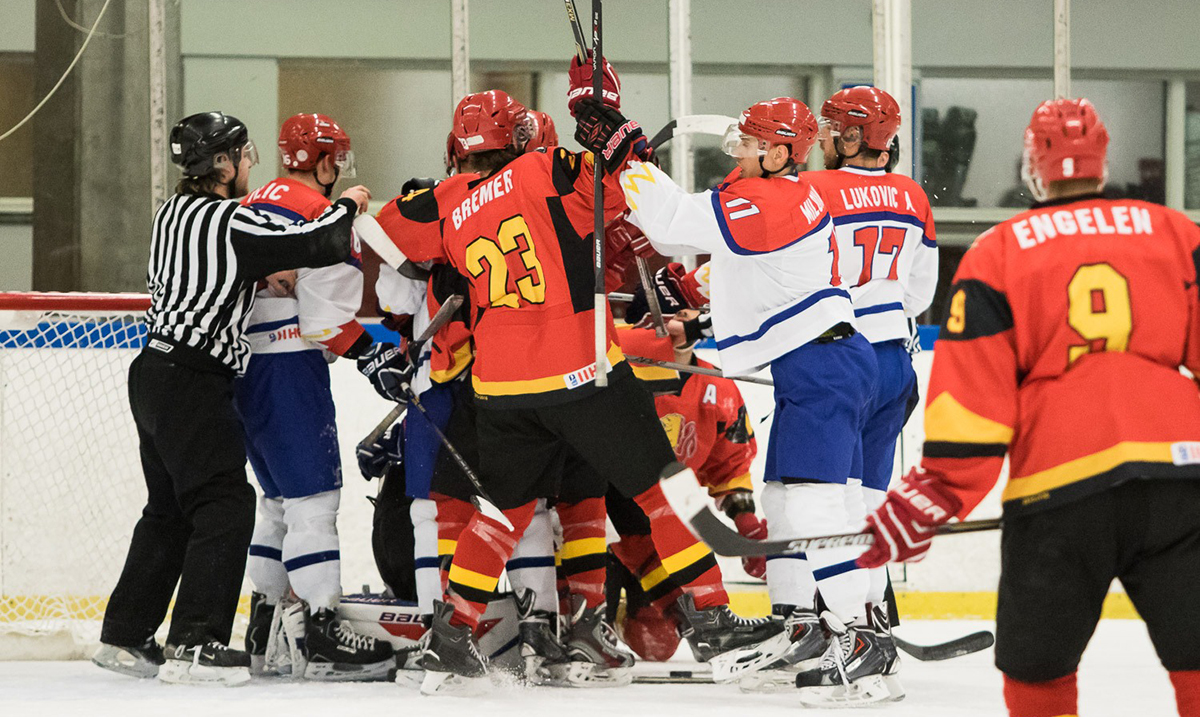Za razliku od prva dva meča na turniru, „Orlovi“ su sjajno započeli duel sa Belgijancima. Već posle 67 sekundi igre kapiten Marko Sretović je preciznim udarcem načeo mrežu rivala, da bi u osmom imao odličnu priliku, golman Kornelis je nekako odbranio svoj gol, ali je odbitak u pogodak pretvorio Pavel Popravka. Imali su naši hokejaši inicijativu tokom najvećeg dela prvog perioda, ali su sami vratili u igru rivala u 17. minutu, kada je Arsenije Ranković loše slabo izbacio pak koji je pokupio iza svog gola, a pak u mrežu našeg tima smestio Žordan Paulus.