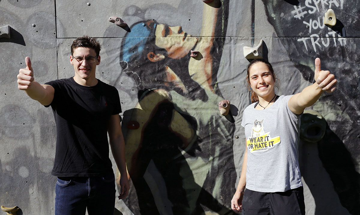 Širok osmeh na licu dvoje srpskih šampiona nakon „osvojene“ veštačke stene na Zemunskom keju. Magnezijum na rukama se pretvorio u sitan prah tokom pozdrava, taman za dobru fotografiju i uspomenu na druženje.