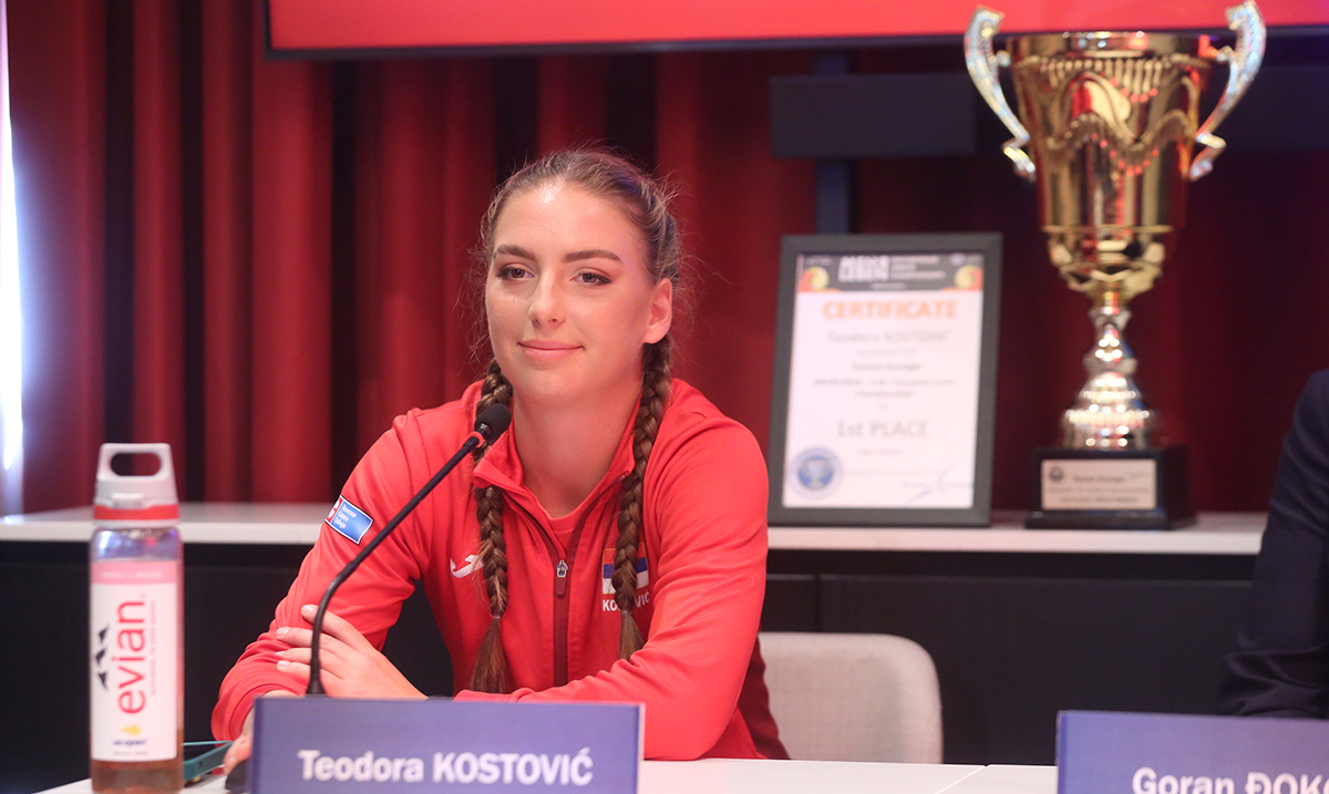 – Nije bitno da li igram u dresu reprezentacije, ili na turnirima, znam da uvek predstavljam Srbiju i moram da pružim maksimum – kaže evropska šampionka do 18 godina Teodora Kostović na konferenciji na kojoj je predstavljena srpskim medijima. – Fenomenalan osećaj, isplatio se sav trud i rad. Srećna sam što sam donela zlatu Srbiji na Evropskom prvenstvu, prošle godine osvojila sam bronzu i to me je jako bolelo. Vratila sam se jača, motivisanija i uspela sam u tome.